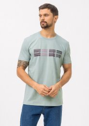 Футболка мужская из трикотажного полотна кулирная гладь, плотность 160 г/м.кв., гребенная пряжа (качество penye), прямая, полуприлегающего силуэта, с короткими втачными рукавами, круглым вырезом горловины, без карманов, без декоративных элементов. На передней детали принт. Рукава контрастные с лампасами. Модель для повседневной носки, отдыха, туризма, занятий спортом. Изделия из натурального хлопка подходят для чувствительной кожи, летнего и зимнего периода, длительное время не разрушаются под влиянием воды и света, они дышащие и легкие.
