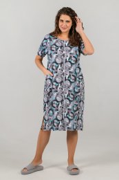 Халат женский из трикотажного полотна кулирная гладь с геометрическим рисунком по всему полотну, прямого кроя, приталенного силуэта, с короткими укороченными рукавами, округлым вырезом горловины, глубокими накладными карманами. Изделия из натурального хлопка подходят для чувствительной кожи, летнего и зимнего периода, они дышащие и легкие.
