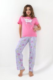 Пижама женская из высококачественного хлопка с тематическим рисунком, состоящая из футболки и шорт. Футболка розового цвета, прямая, свободного кроя, укороченная, с короткими втачными рукавами, спущенной линией плеча, круглым вырезом горловины. Шорты короткие, прямые, свободного кроя, без карманов и декоративных элементов. Пояс на удобной мягкой резинке. Модель сочетает в себе комфорт и качество, позволяет чувствовать себя женственно и стильно. Подходит для сна и отдыха. Рекомендуется бережная стирка при t не более 30°C, отбеливание запрещено.