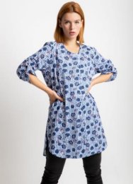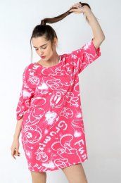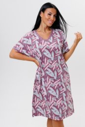 Туника женская с набивным рисунком, из гладкокрашеного трикотажного полотна кулирная гладь, прямая, свободного кроя, укороченная, с короткими втачными рукавами, приспущенным плечом, круглым вырезом горловины, без декоративных элементов, без карманов, разрезами в боковых швах. Горловина овальной формы обработана притачной бейкой. Удобный свободный крой дарит комфорт и ощущение свободы движений. Модель предназначена для повседневной носки. Одежда из хлопка комфортна и приятна для кожи, дышащая и легкая. Рекомендуется бережная стирка при 30С.