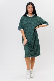 Туника женская зеленого цвета из принтованного трикотажного полотна кулирная гладь с эффектом варенки, в стиле оверсайз, прямая, свободного силуэта, со спущенной линией плеча. Капюшон и рукава имеют красиво обработанный край. Аппликация из страз придает практичному образу легкий шарм. Небольшие боковые разрезы способствуют эргономичности и свободе движений. Дополняют образ вместительные карманы.