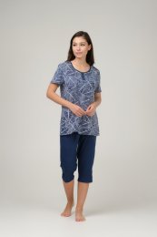Комплект женский из трикотажного полотна, состоящий из футболки и шорт. Футболка – из гладкокрашеного полотна, с короткими цельнокроеными рукавами, горловиной V-образной формы, обработанной втачной планкой и принтом "Собачка на велосипеде" на полочке. Шорты - из полотна с абстрактным рисунком, средней длины на широком притачном поясе с эластичной тесьмой внутри, с двумя карманами в боковых швах.