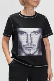 Футболка женская из трикотажного полотна кулирная гладь, прямая, свободного кроя, с короткими втачными рукавами, круглым вырезом горловины, контрастной отделкой. На полочке настрочена аппликация.